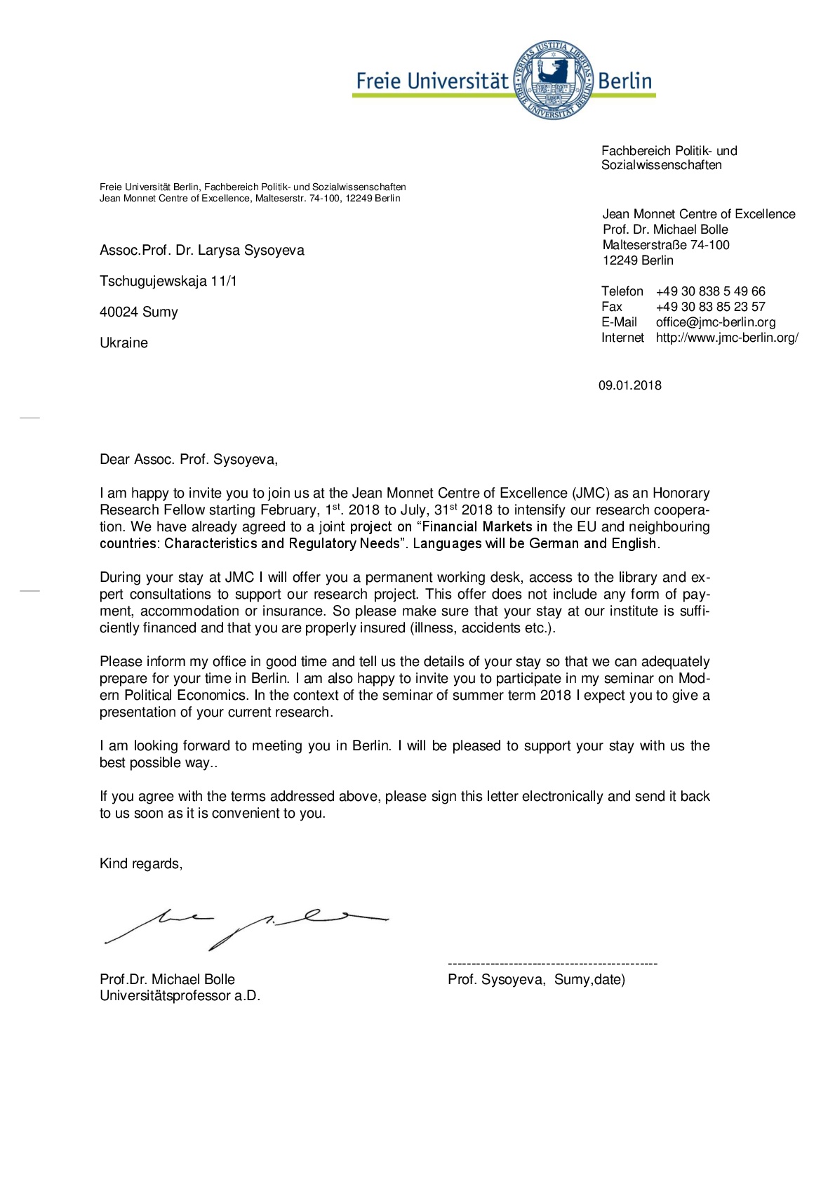 Доцент кафедри фінансів, банківської справи та страхування Сисоєва Лариса Юріївна отримала місце позаштатного Honorary Research Fellow у Центрі Жана Моне (Вільний Університет м. Берлін) з проектом “Financial Markets in the EU and neighbouring countries: Characteristics and Regulatory Needs” з 1 лютого 2018 р. по 31 липня 2018 р.