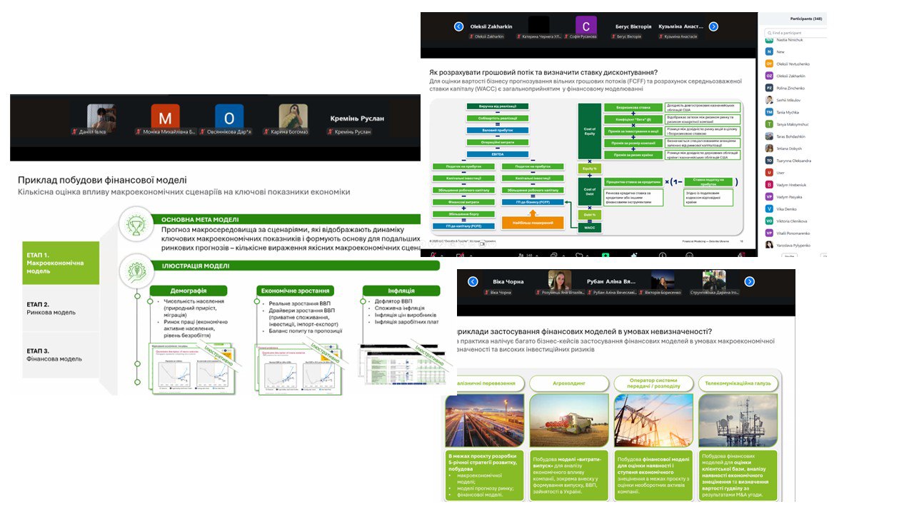 The first event of the day was a webinar hosted by Deloitte, one of the largest professional services firms in the world, providing audit, business consulting, financial advisory, risk management, and tax services. The topic of the webinar was “How Numbers Become the Foundation of Strategy: The Art of Financial Modeling”. Speakers Andrii Kulyk, Manager at the Financial Advisory Department of Deloitte Ukraine, and Nazar Popriichuk, Consultant at the same department, shared practical insights into the use of financial models in strategic decision-making. They discussed various areas where financial modeling is applied: from M&A transactions to strategic consulting key elements of effective models, and the impact of macroeconomic instability on DCF-based business valuation.