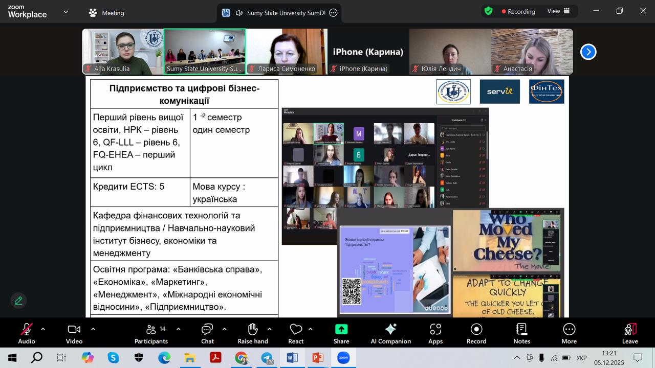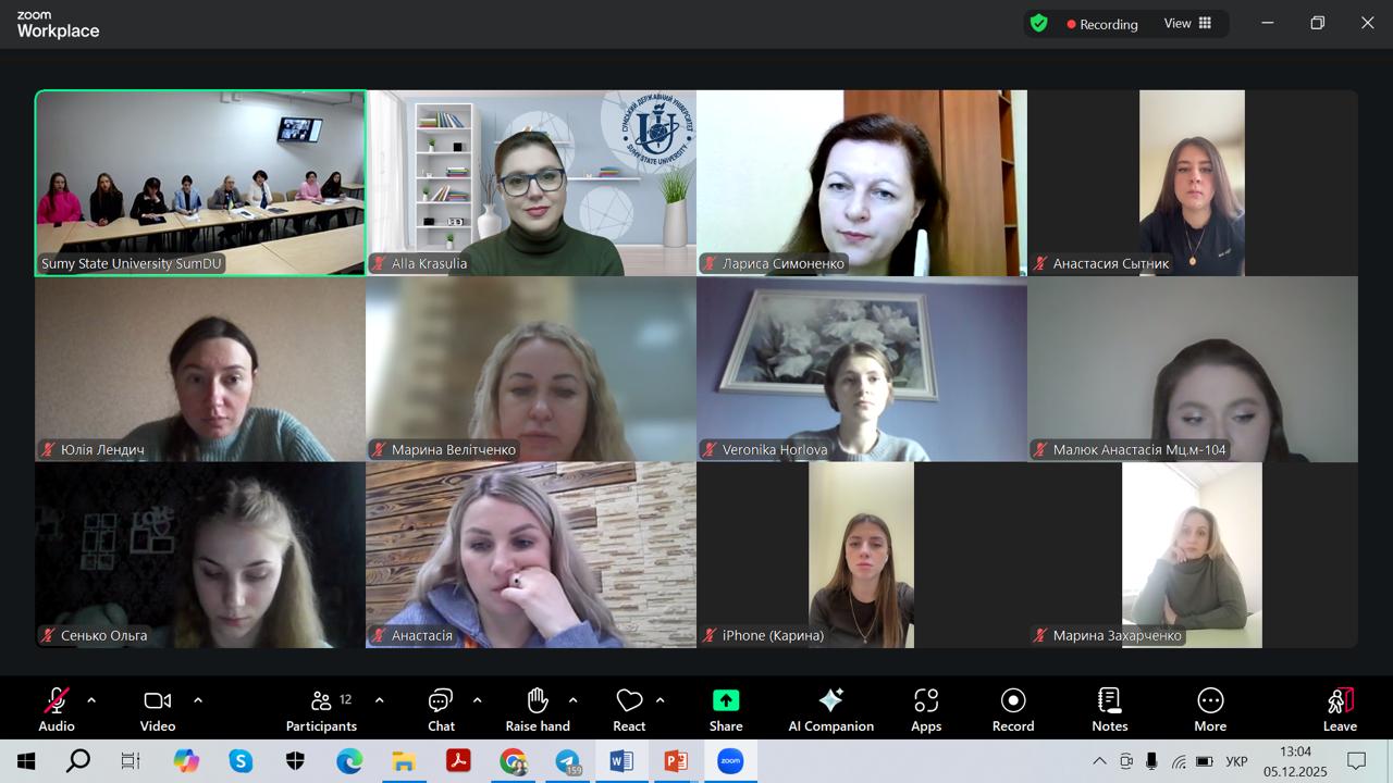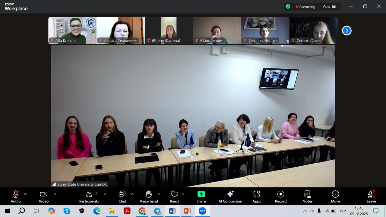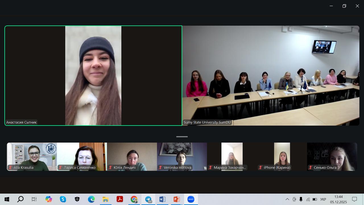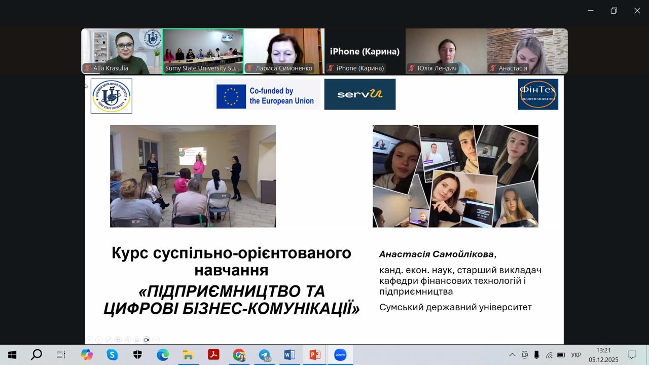 On December 5, 2025, PhD, Senior Lecturer of the Department Anastasiia SAMOILIKOVA, together with first-year students of the BiEM Institute Daria SKRYPNYK (Educational Program “Banking”), Anastasiia SYTNYK (“Entrepreneurship”), Daria ANDRIIENKO (“Marketing”), and Bohdana BORONINA (“International Economic Relations”), shared their experiences of teaching and studying the service learning course “Entrepreneurship and Digital Business Communications” during the workshop “Reflective Analysis of the Service-Learning Experience within the SerVU Project”, held at SumDU in a mix format.