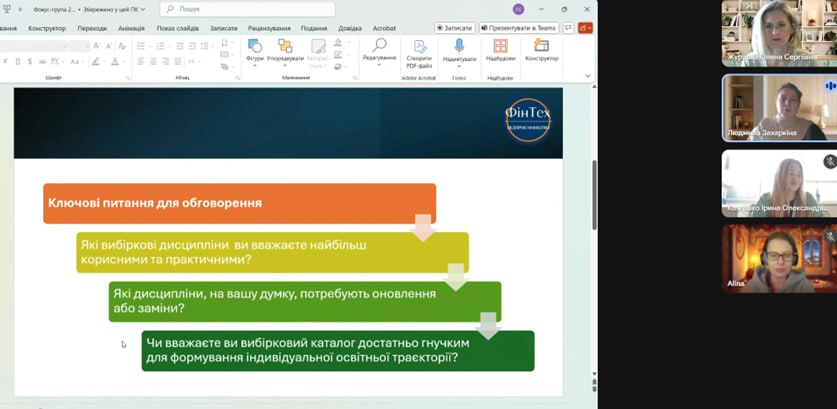 Отримані результати фокус-групи будуть узагальнені та враховані робочою проєктною групою освітньої програми «Фінанси» під час перегляду каталогів вибіркових дисциплін на 2026/2027 навчальний рік.