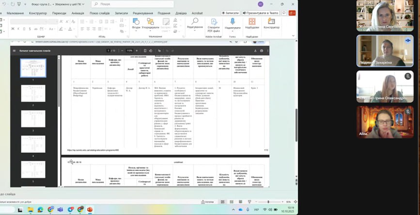 10 жовтня 2025 року члени робочої проєктної групи освітньої програми «Фінанси» провели фокус-групу зі здобувачами першого курсу магістерського рівня з метою отримання зворотного зв’язку та пропозицій щодо оновлення каталогів вибіркових дисциплін.