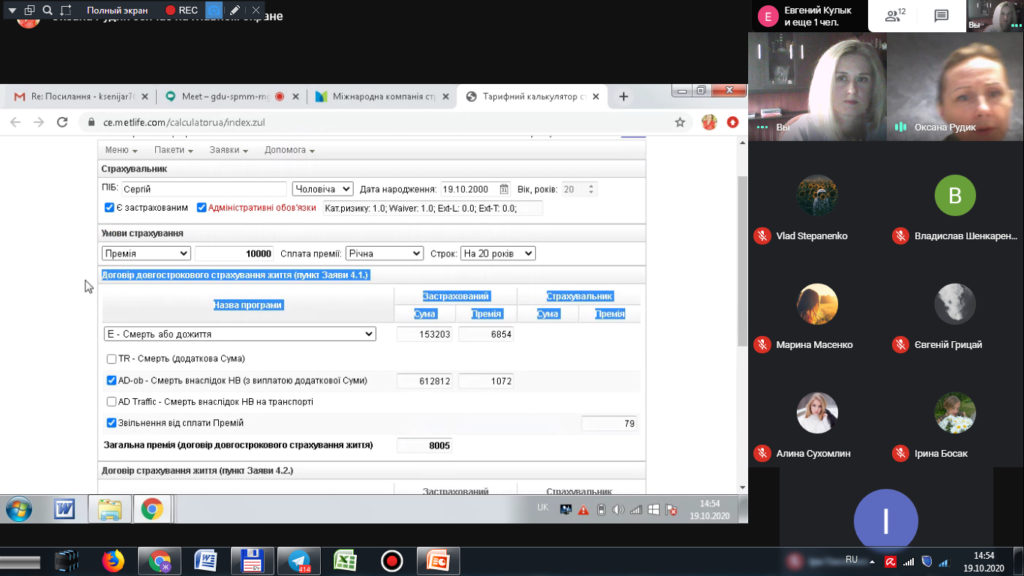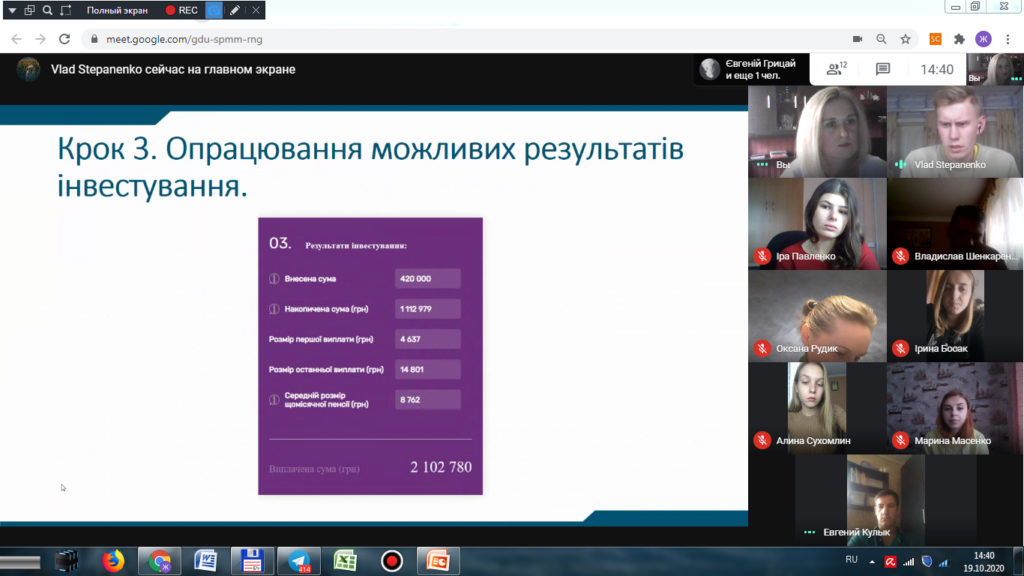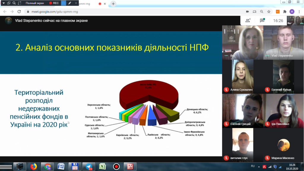 19.10.2020 р. доцент кафедри Журавка О.С. провела відкрите практичне заняття на тему «Розвиток недержавного пенсійного страхування в Україні» для студентів 3 та 4 курсу спеціальності «Фінанси, банківська справа та страхування» в режимі відео-конференції за допомогою платформи Googlе Meet.