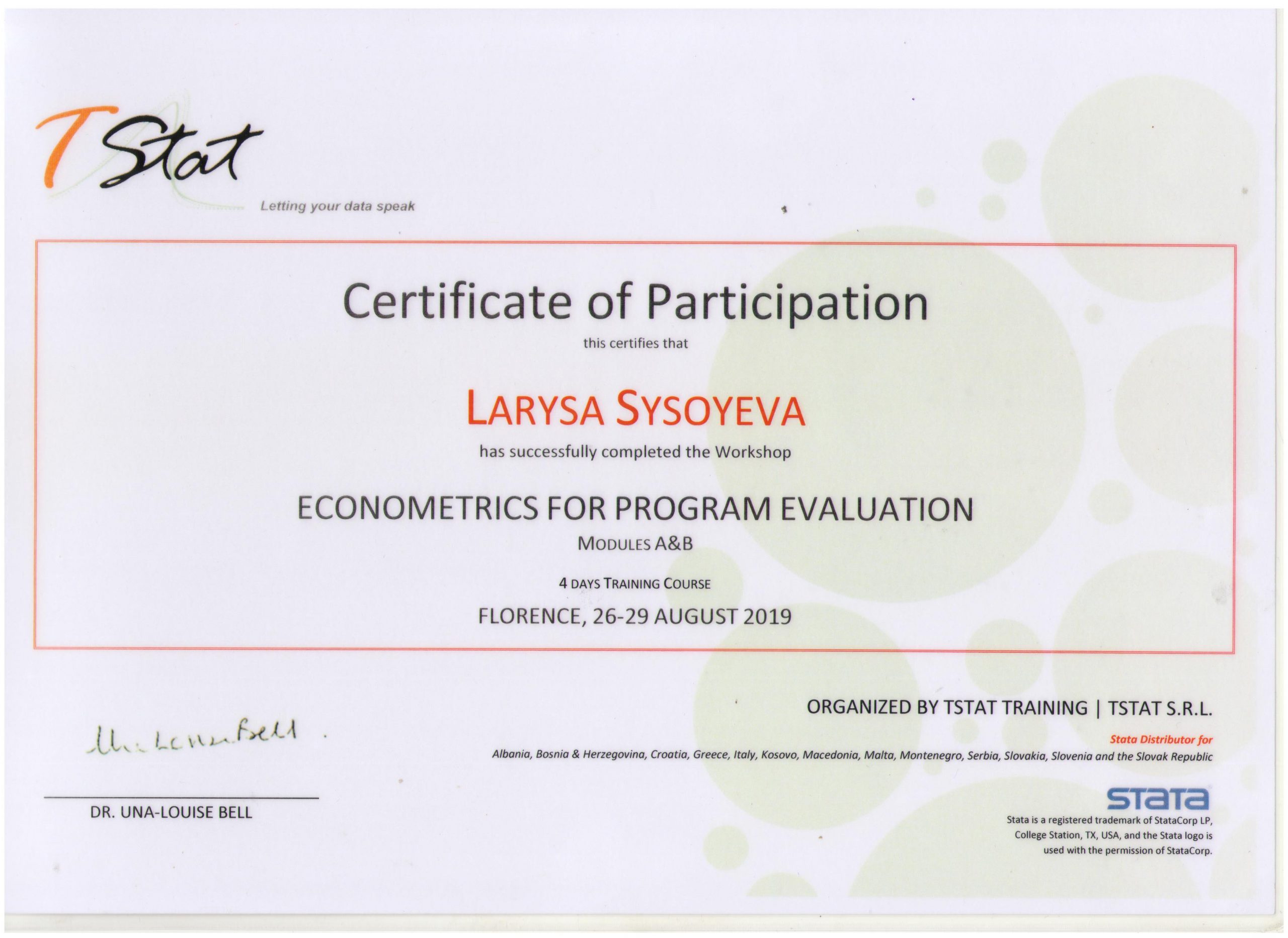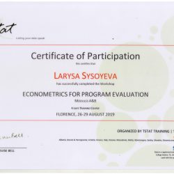 26-29 серпня доцент кафедри фінансів, банківської справи і страхування Сисоєва Л.Ю. відвідала міжнародні курси з підвищення кваліфікації „Економетрика для програмної оцінки: практичні аспекти використання STATA“, які було організовано навчальним центром TStat, що є провідною компанією економетричного та статистичного програмного забезпечення в Європі. В рамках курсу було розглянуто наступні питання: попередній аналіз статистичних даних, управління даними в програмі STATA, теорія і практика використання статичних графіків тощо.