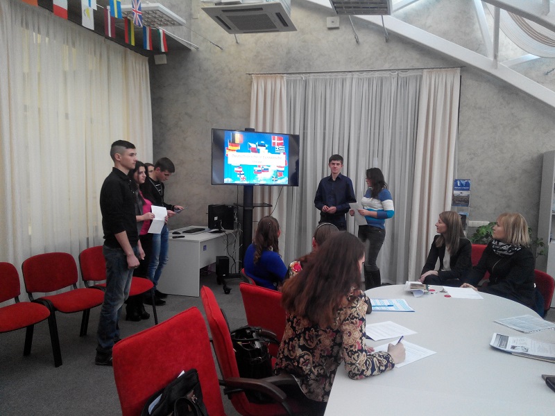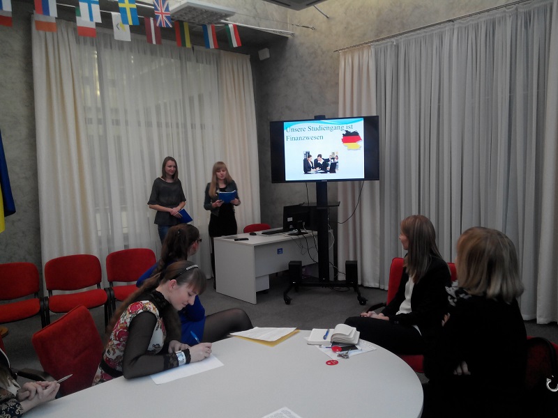 17.11.14 в 14.00 в Інформаційному центрі Європейського Союзу відбулася чергова зустріч студентів в рамках проекту кафедри банківської справи «Молодіжні дебати». Форматом цих дебатів передбачалося залучення всіх студентів, що вивчають німецьку мову для обговорення теми «Німецька мова і моя майбутня професія». Під час підготовки до заходу до проекту долучилася кафедра іноземних мов.
