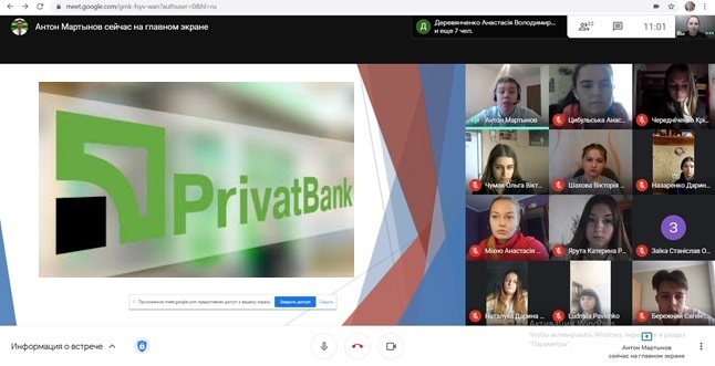 Спікером було запрошено керівника напрямку з активних операцій МСБ Сумської філії АТ КБ ПриватБанку – Антона Мартинова, який сам є випускником кафедри. Особливу увагу приділили питанням, які завжди є актуальними для студентів: працевлаштування та перспективи випускників в майбутньому. На власному прикладі Антон Сергійович поділився досвідом, який допоміг побудувати успішну кар’єру в одному із сучасних банків України. Акцентували увагу на питаннях, які є першочерговими: – З чого потрібно розпочати, щоб побудувати кар’єру в банку? – Які фахові компетенції сьогодні є першочерговими для сучасного роботодавця з урахуванням стрімкого розвитку інновацій? – Який рівень знань та які якості повинен мати сьогодні студент, щоб досягти призначення на омріяну посаду? – На чому необхідно зосередитись першокурснику під час навчання, щоб в майбутньому бути конкурентоздатним на ринку праці?