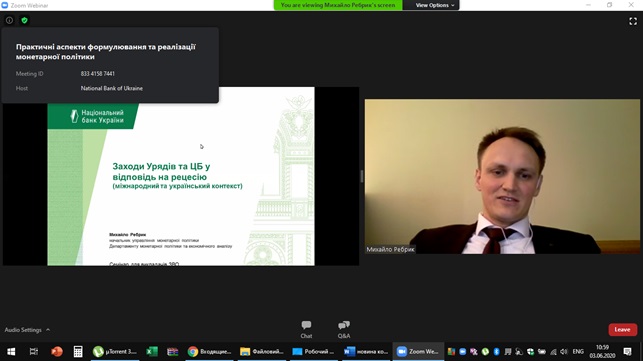 2 – 3 червня відбувся он-лайн семінар «Практичні аспекти формулювання та реалізації монетарної політики», що проводився фахівцями Національного банку України для викладачів закладів вищої освіти.