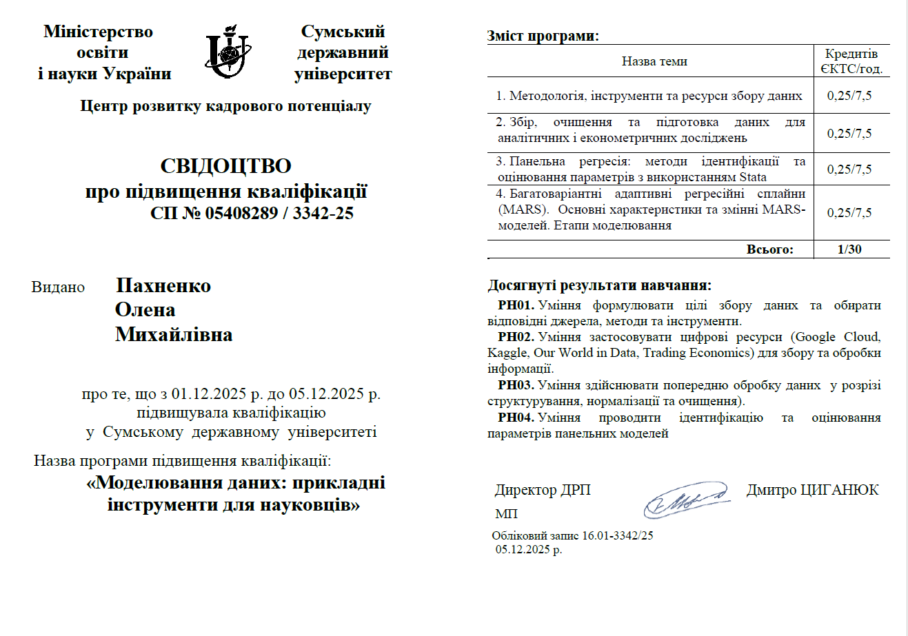 2025: Підвищення кваліфікації за програмою «Моделювання даних: прикладні інструменти для науковців» (01.12.2025-05.12.2025). Сумський державний університет, Свідоцтво СП № 05408289 / 3342-25 (Свідоцтво)