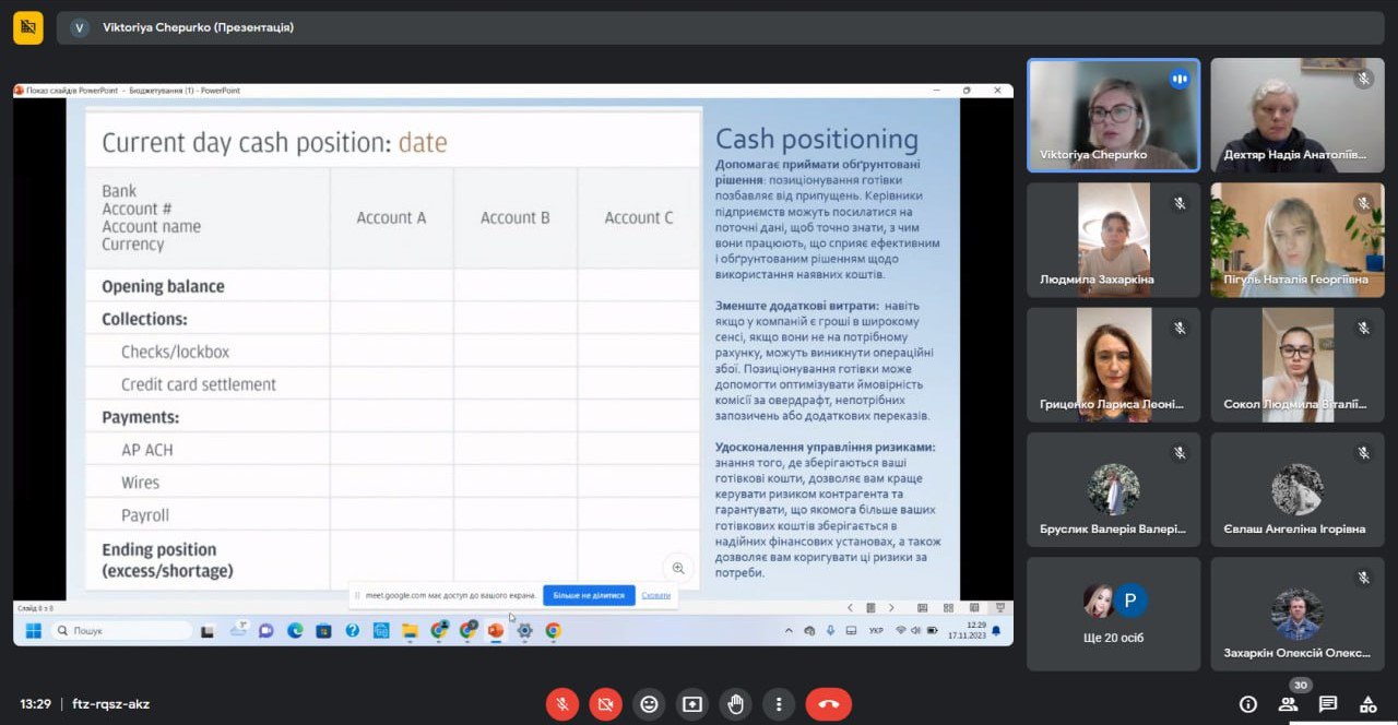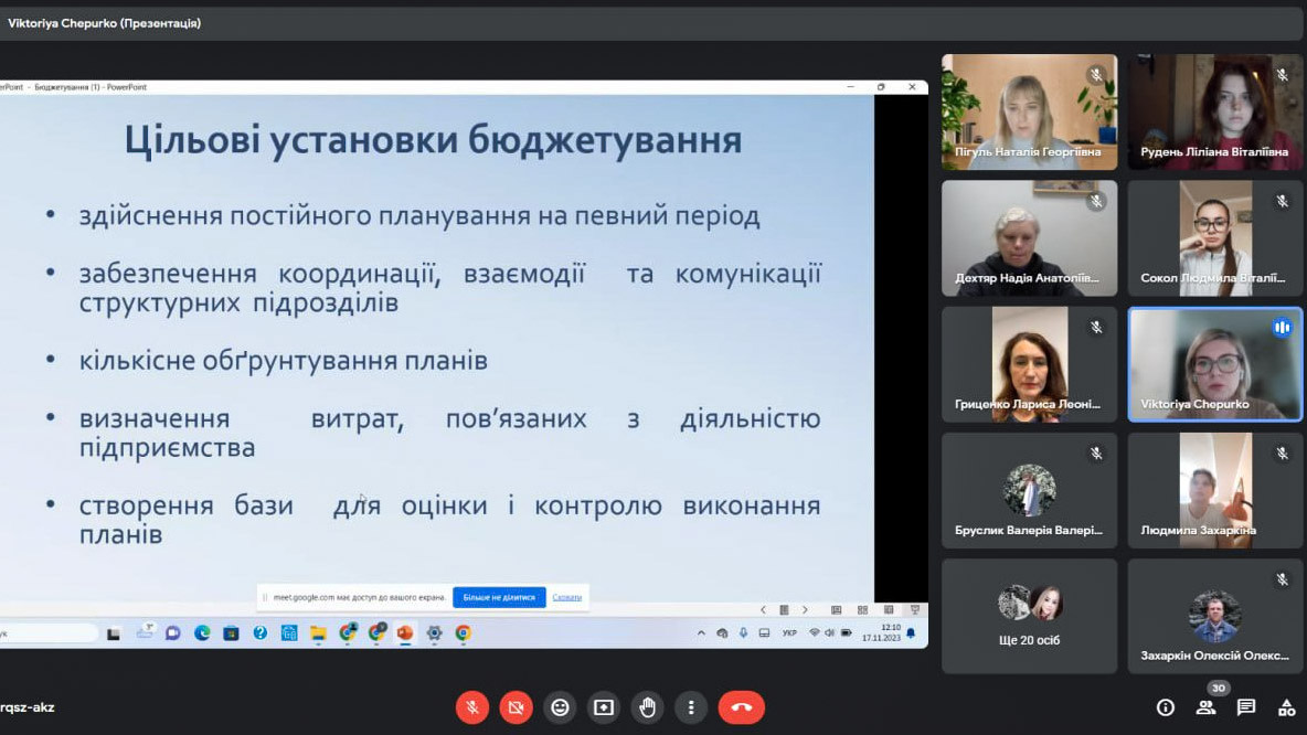 17 листопада 2023 року студенти 072 «Фінанси, банківська справа та страхування» і 076 «Підприємництво, торгівля та біржова діяльність» рівнів «бакалавр» і «магістр» та викладачі кафедри фінансових технологій та підприємництва брали участь у гостьовій лекції з дисципліни «Корпоративні фінанси» на тему «Методичні основи бюджетування». Спікером виступила Чепурко Вікторія Олександрівна – заступник начальника управління фінансів – начальник відділу управлінського обліку АТ «СМНВО- Інжиніринг», аналітик, контролер JP Morgan and Chase, Варшавський офіс. Під час зустрічі були розглянуті та обговорені основні питання, що пов’язані з процесом бюджетування на підприємствах, зокрема, сутність та значення бюджетування в управлінні підприємством, організація бюджетного процесу на підприємствах, особливості технології формування операційних та фінансових бюджетів. Лекція була цікавою та корисною.
