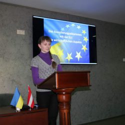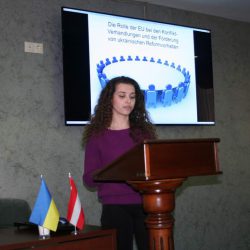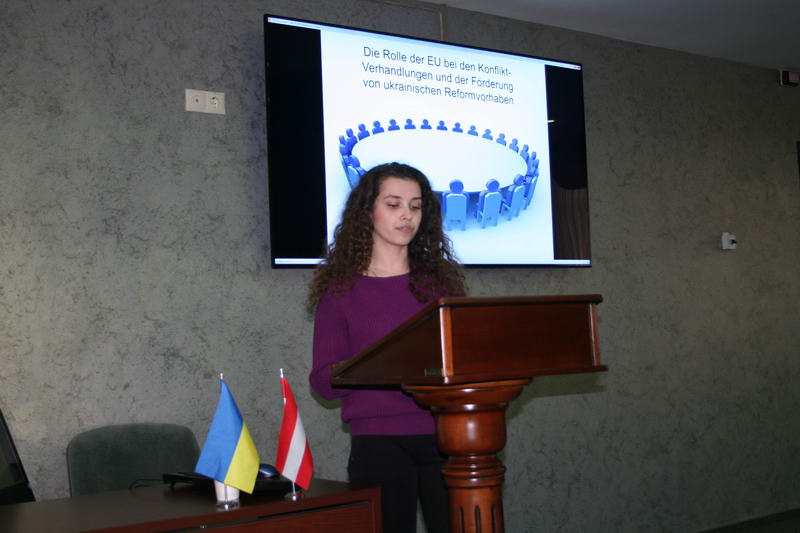 Наступну доповідь на тему «Роль Європейського Союзу в розвитку України» презентувала студентка Друженець М. (МЕ-32). Студентка мала обґрунтовану позицію щодо визначальної ролі провідних країн Європи в українсько-російському конфлікті. Крім того, в своїй презентації Друженець М. довела до учасників зустрічі дані соціологічного опитування європейців щодо їх відношення до України, санкцій проти Росії, а також воєнного конфлікту на Донбасі. Як зазначив запрошений професор Армін Камель, важливим є те, що переважна більшість європейців розуміють необхідність економічної, політичної та гуманітарної підтримки України на сучасному етапі її розвитку.