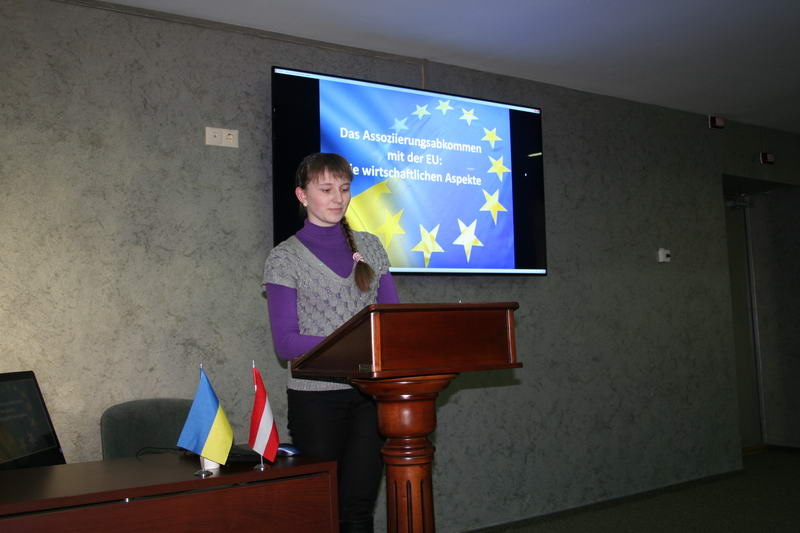 Першою презентувала доповідь студентка академії Шапаренко А. (ОА-22), яка розповіла про економічні переваги для України після підписання угоди про асоціацію з Євросоюзом. Під час обговорення Др. Армін Камель наголосив на необхідності проведення структурних реформ та трансформаційних змін в Україні.
