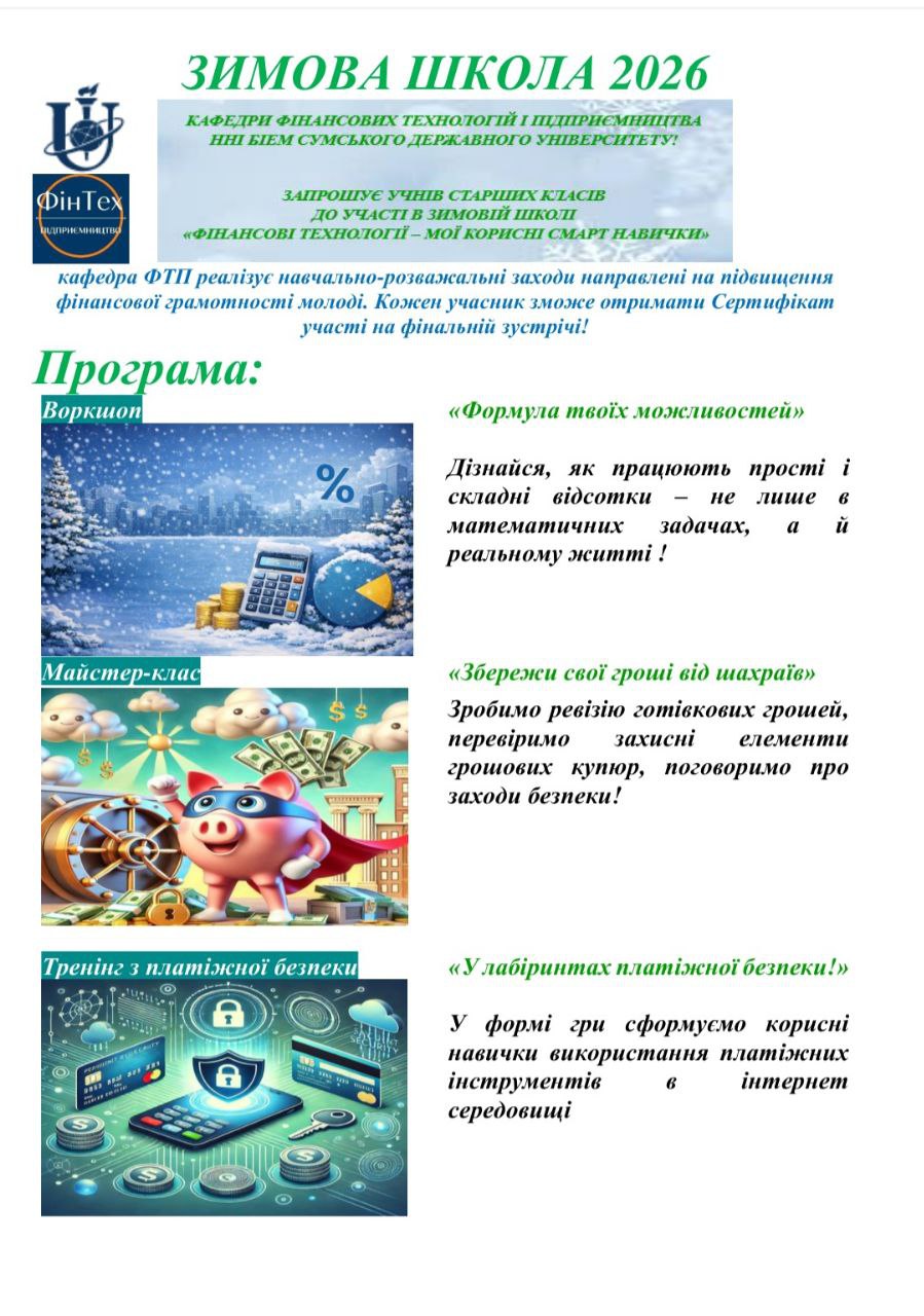 | 3.Всесвітній День Заощаджень 2023 (ЗОШ №15) | Журавка О.С., Рябушка Л.Б. https://fintech.biem.sumdu.edu.ua/kafedra-finansovih-tehnologij-i-pidpriiemnictva-prodovzhuie-prosvitnicki-zahodi-shho-prisvjacheni-vsesvitnomu-dnju-zaoshhadzhen |