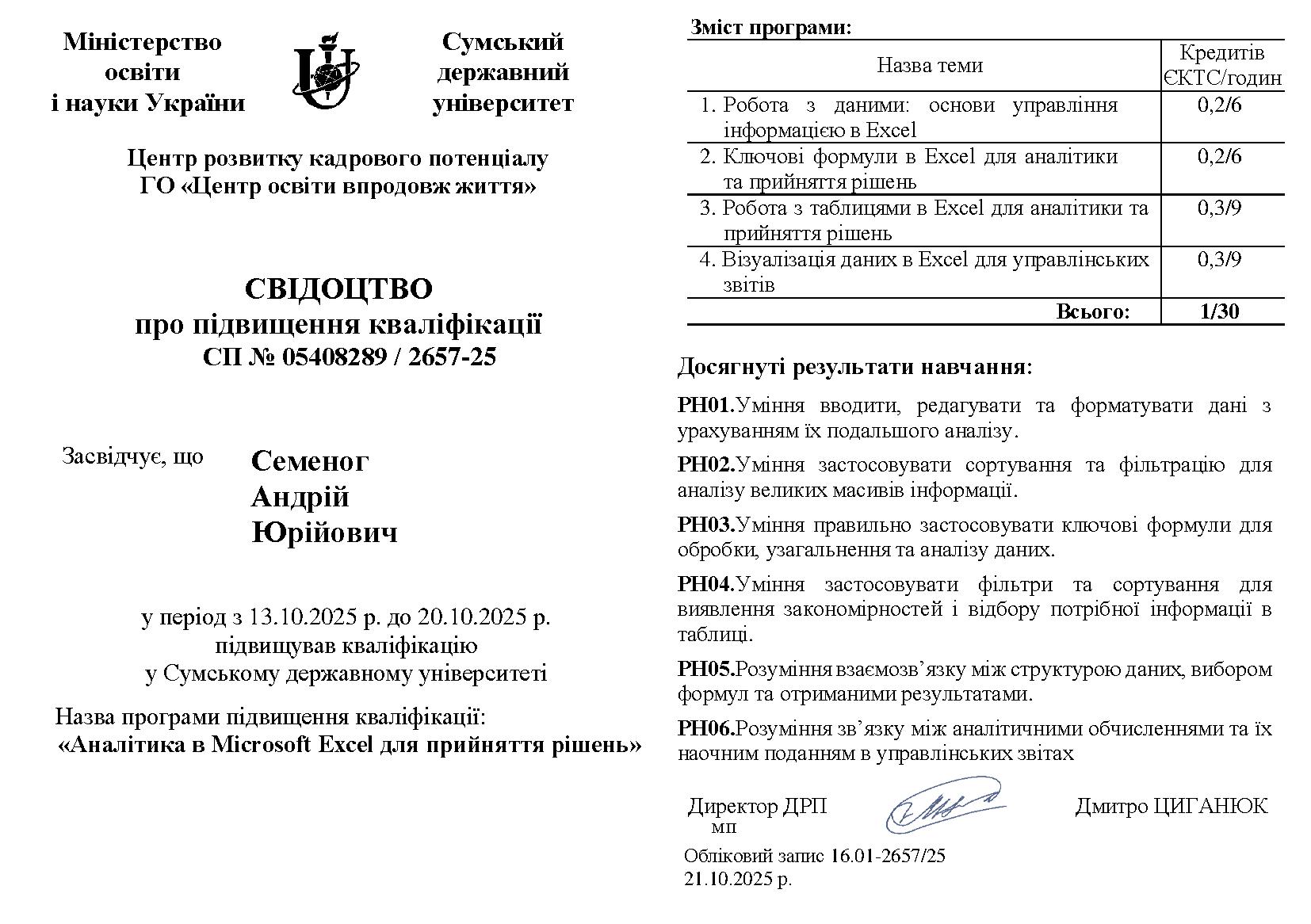 2025: Сумський державний університет, свідоцтво про підвищення кваліфікації за тематичним спрямуванням «Аналітика в Microsoft Excel для прийняття рішень» (13.10.2025-20.10.2025), СП № 05408289 / 2657-25, обсяг: 1 кредит, 30 годин (Свідоцтво про підвищення кваліфікації)