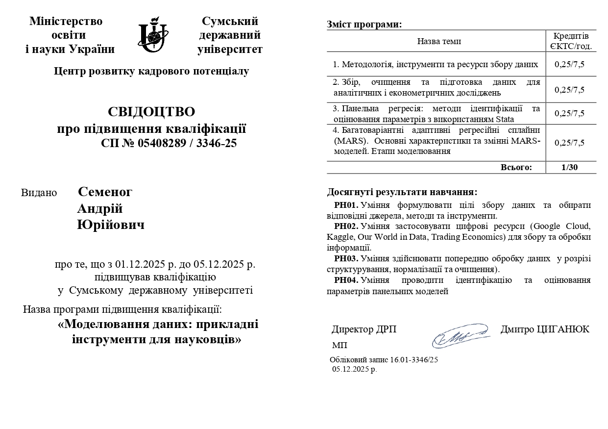 2025: Сумський державний університет, свідоцтво про підвищення кваліфікації за тематичним спрямуванням «Моделювання даних: прикладні інструменти для науковців» (01.12.2025-05.12.2025), СП № 05408289 / 3346-25, дата: 05.12.2025, обсяг: 1 кредит, 30 годин (Свідоцтво про підвищення кваліфікації)