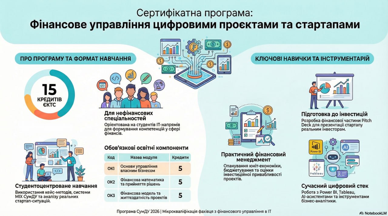 Курс навчає застосовувати фінансову математику й цифрові інструменти для обґрунтованих рішень у цифрових проєктах: вартість грошей у часі, ефективність, ризики, юнітекономіка