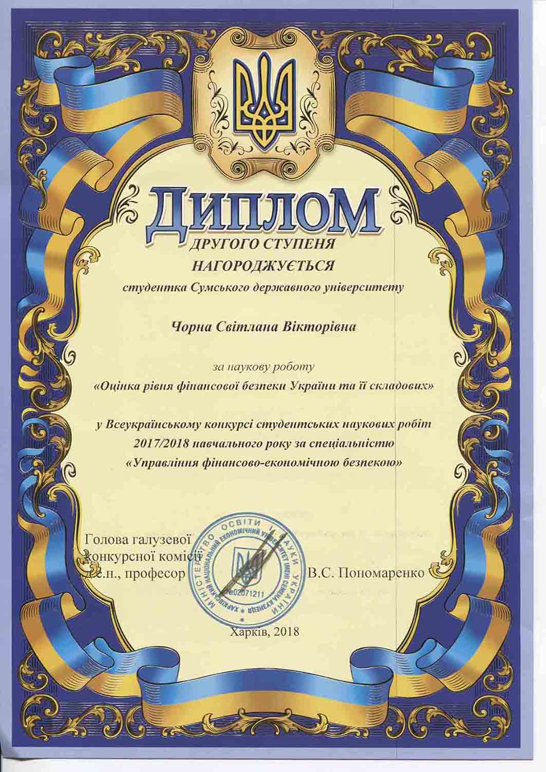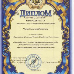 Студентка магістратури спеціальності «Фінанси, банківська справа та страхування» Чорна Світлана представляла результати наукової роботи на тему: «Оцінка рівня фінансової безпеки України та її складових» та виборола ІІ місце.