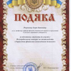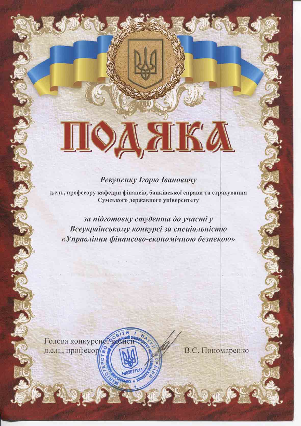 Науковий керівник – професор кафедри фінансів, банківської справи та страхування, д.е.н., Ігор Іванович Рекуненко.