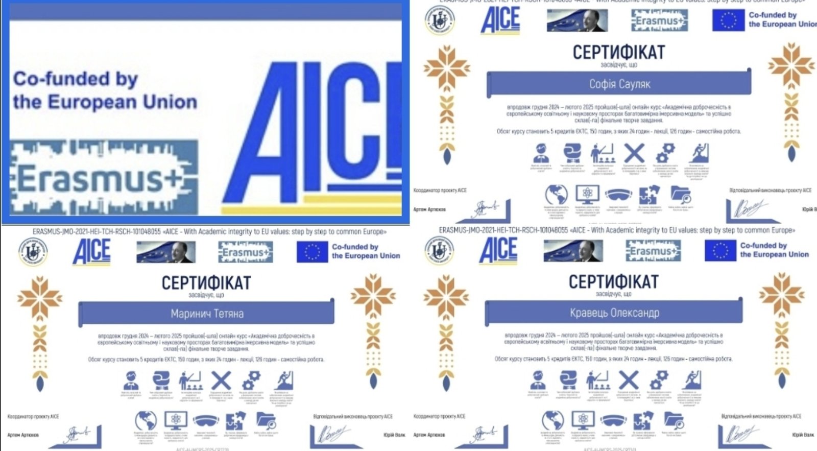 Студенти освітніх програм «Фінанси» та «Банківська справа» протягом грудня 2024-лютого 2025 мали змогу взяти участь у курсі «Академічна доброчесність в європейському освітньому і науковому просторах: багатовимірна імерсивна модель», який реалізовувався в межах міжнародного проєкту «AICE – With Academic Integrity to EU Values: Step by Step to Common Europe».