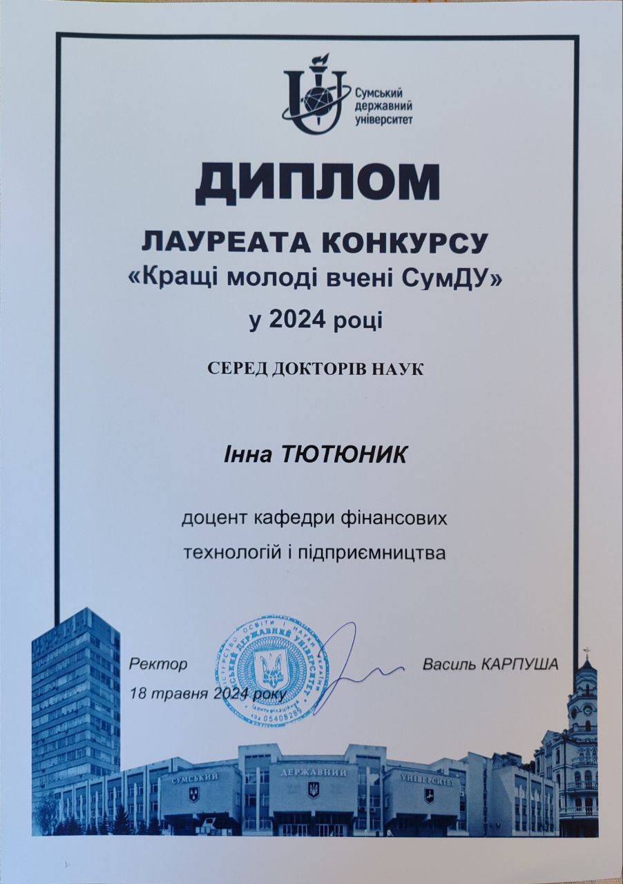 2024: Лауреат конкурсу “Кращі молоді вчені СумДУ у 2024 році” (Диплом)