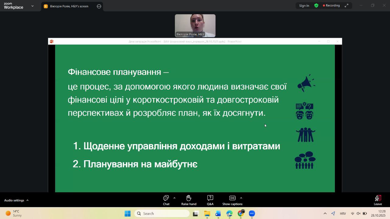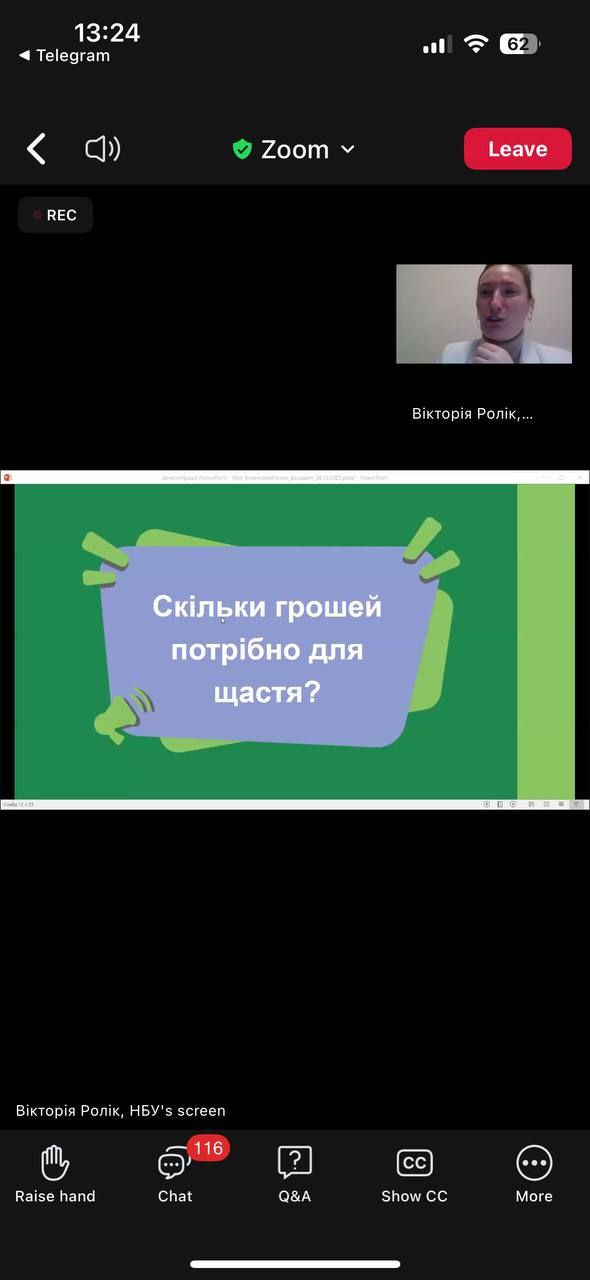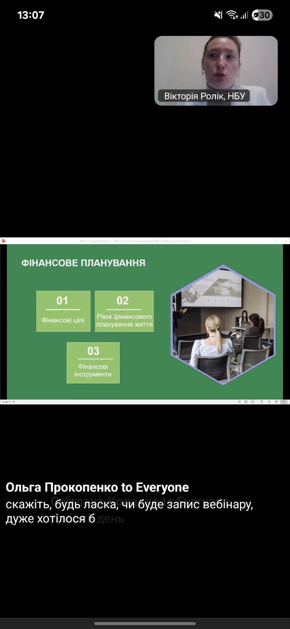 8 жовтня 2025 студенти освітньої програми «Фінанси» (бакалаврського ступеня гр.Ф-21,Ф-31,Ф-41 та магістерського ступеня Ф.м-51), освітної програми «Банківська справа» (бакалаврського ступеня БС-21, БС-31, БС-41) взяли участь у воркшопі «Мій фінансовий план» від головного експерта НБУ управління зв’язків з громадськістю та фінансової обізнаності Вікторії Ролік.