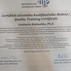 В рамках міжнародної мобільності студентів і лекторів на основі підписаного Меморандуму між Сумським державним університетом та Метрополітним університетом Прага (Чеська республіка) викладачі кафедри фінансів, банківської справи та страхування Рябушка Л.Б., Павленко Л.Д. та студентка 4 курсу бакалаврату спеціальності «Фінанси, банківська справа та страхування» Діденко Ксенія в період з 28.10.2019 по 05.11.2019 були запрошені взяти участь в кваліфікаційній програмі на тему: «Сучасні методи навчання, науково-педагогічний розвиток, дистанційна освіта та міжкультурна комунікація в системі загальноєвропейського освітнього простору», що відбулась в м.Прага.
