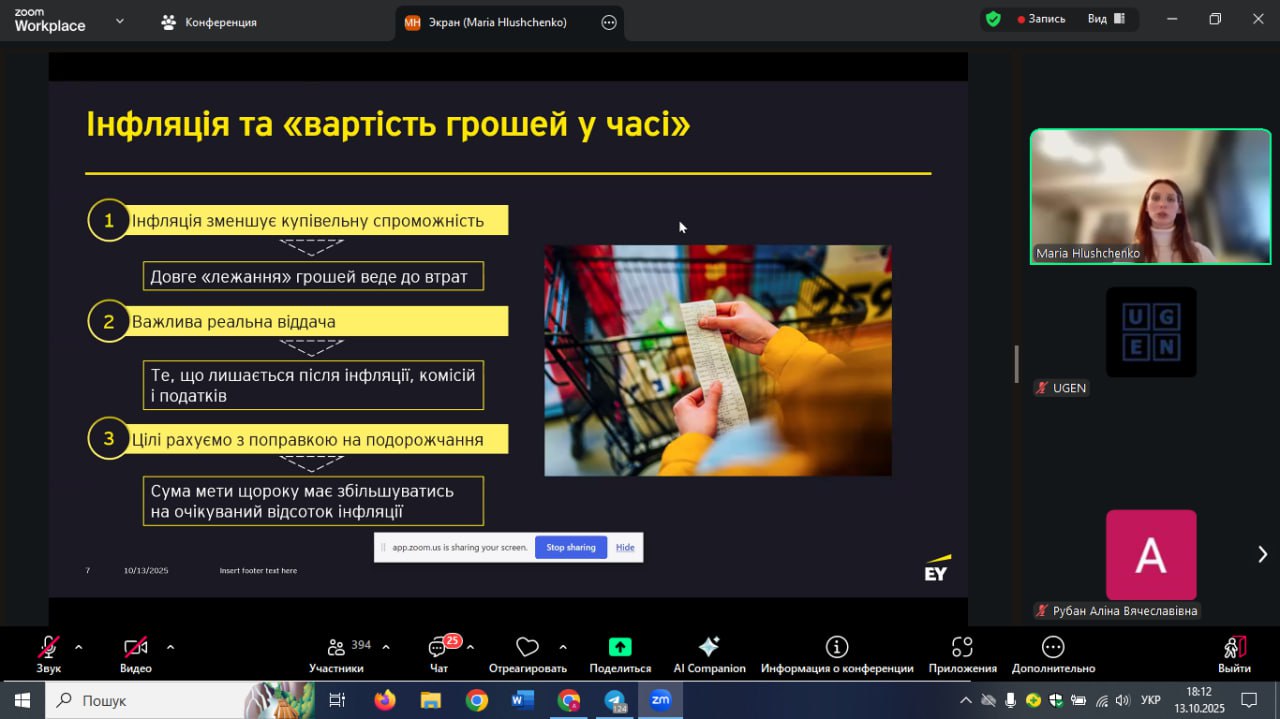 Представниця EY Ukraine, аналітик Марія Глущенко, провела вебінар «Як керувати особистими фінансами: бюджетування, планування, заощадження», під час якого здобувачі дізналися про принципи фінансового планування, правило 50/30/20 та інструменти валютного хеджування.