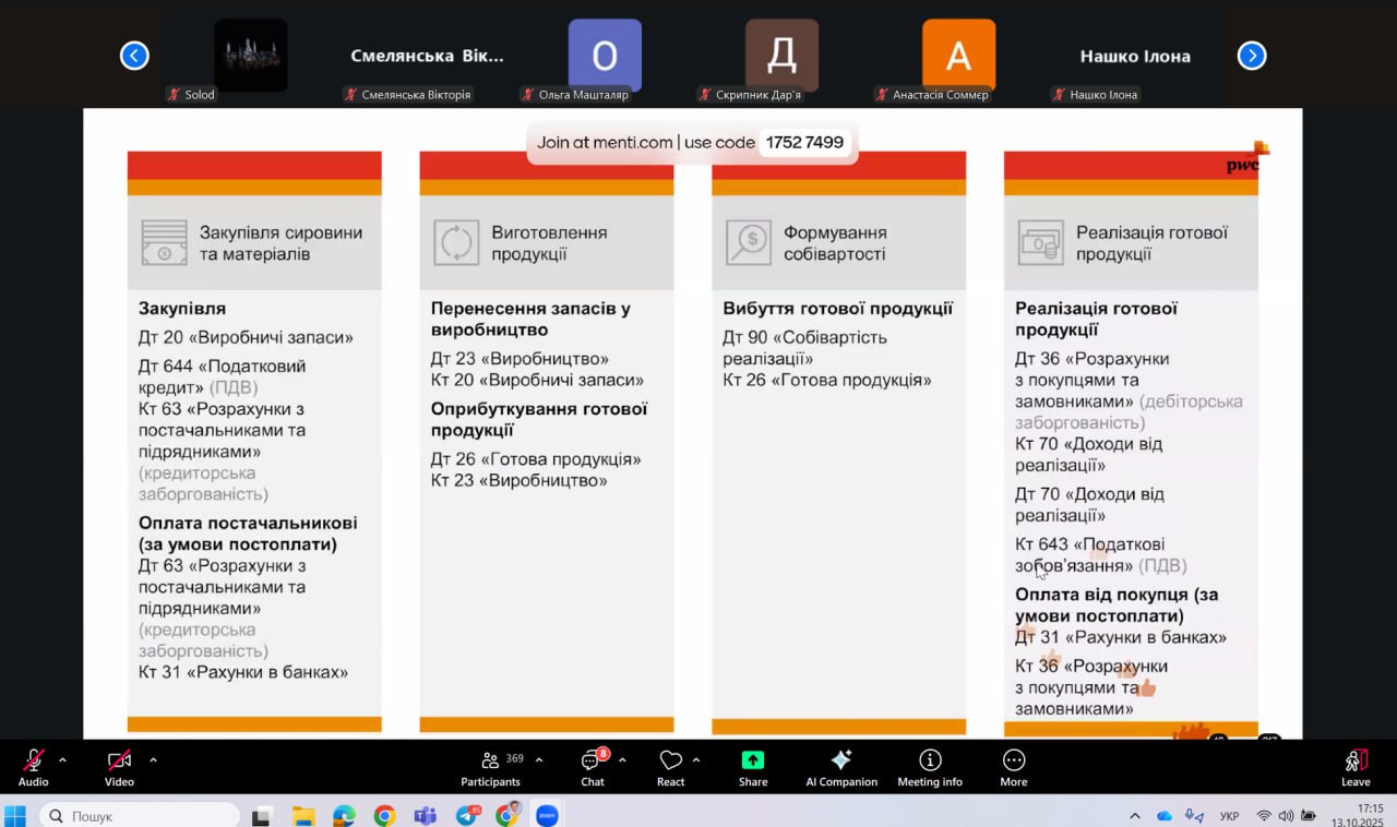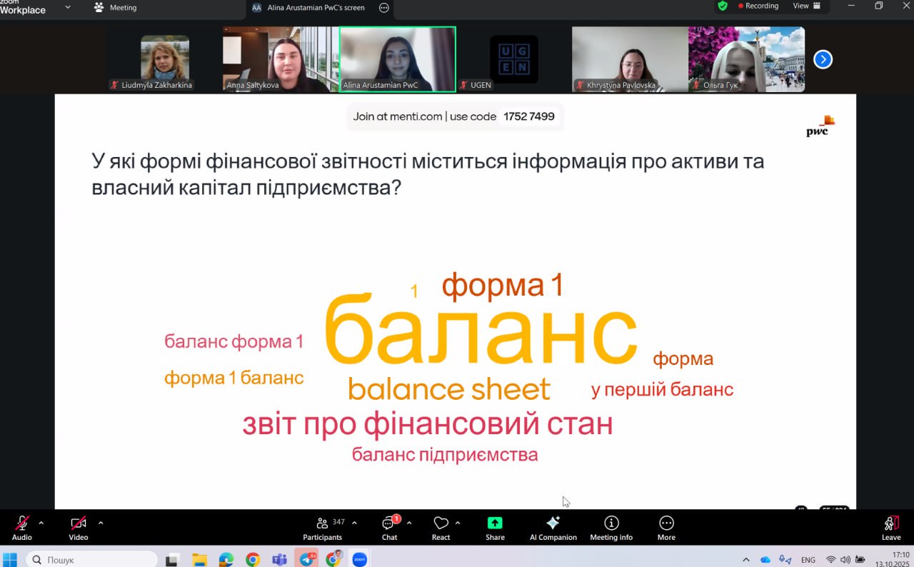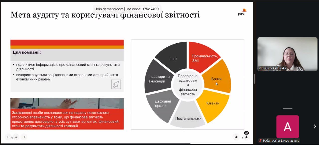 У межах заходу фахівчині компанії PwC представили тему «Фінансова звітність і аналіз. Бухоблік», де розкрили структуру фінансової звітності, її види та роль аудиту у забезпеченні прозорості бізнесу.