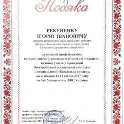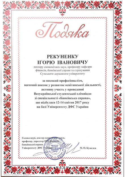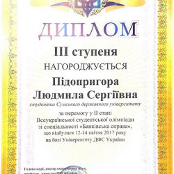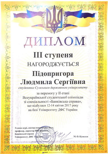 Кафедра вітає студентку четвертого курсу спеціальності «Фінанси і кредит» (банківські технології і процеси) Підопригору Людмилу та її керівників д.е.н, професора Рекуненко І.І. та д.е.н, професора Бєлову І.В. з отриманням диплома 3-го ступеня у другому етапі Всеукраїнської студентської олімпіади зі спеціальності «Банківська справа», що відбулася в Університеті державної фіскальної служби України (м. Ірпінь). За підсумками олімпіади студентка Васильчук Аліна (гр.БС-33а) отримала грамоту у номінації «За аргументованість думки». Доречи, професор кафедри фінансів, банківської справи та страхування ННІ БТ «УАБС», д.е.н. Рекуненко І.І. прийняв участь в олімпіаді у якості члена журі.