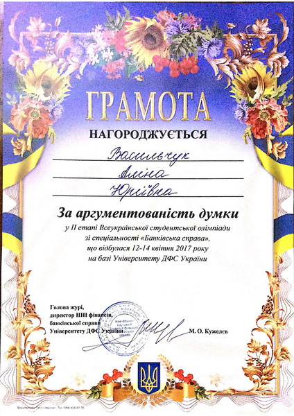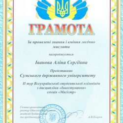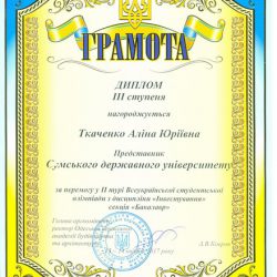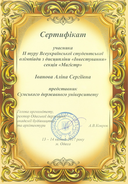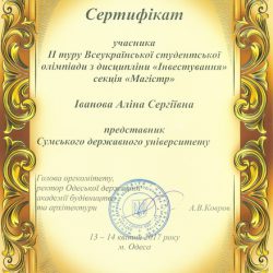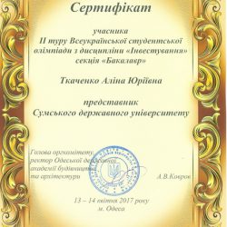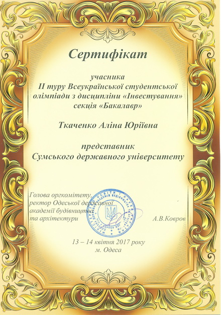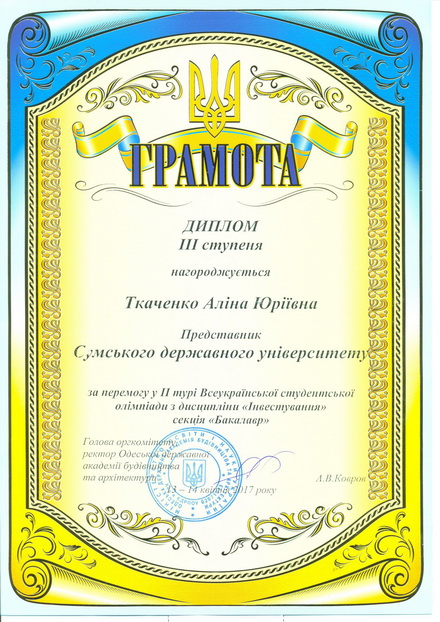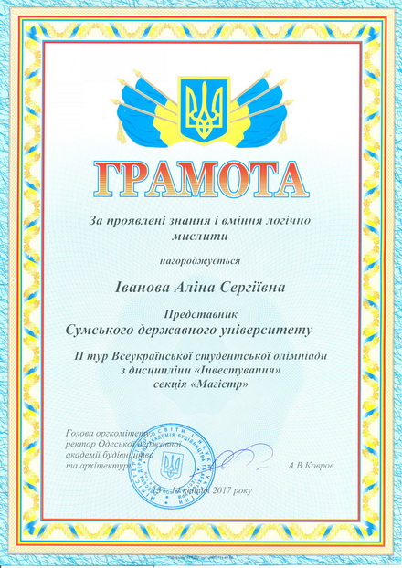 Ми також вітаємо студентку четвертого курсу спеціальності «Фінанси та кредит» (фінанси) Ткаченко Аліну за зайняте 3 місце у II турі Всеукраїнської студентської олімпіади з дисципліни «Інвестування», секція «Бакалавр» (наукові керівники – к.е.н, доцент Дейнека О. В., к.е.н. ст. викладач Мордань Є.Ю.). Олімпіада проводилася на базі Одеської державної академії будівництва та архітектури. Окремою грамотою за проявленні знання та вміння логічно мислити була відзначена студентка п’ятого курсу спеціальності «Фінанси, банківська справа та страхування» Іванова Аліна (наукові керівники – к.е.н, доцент Дейнека О.В. , д.е.н. проф. Рекуненко І.І.).