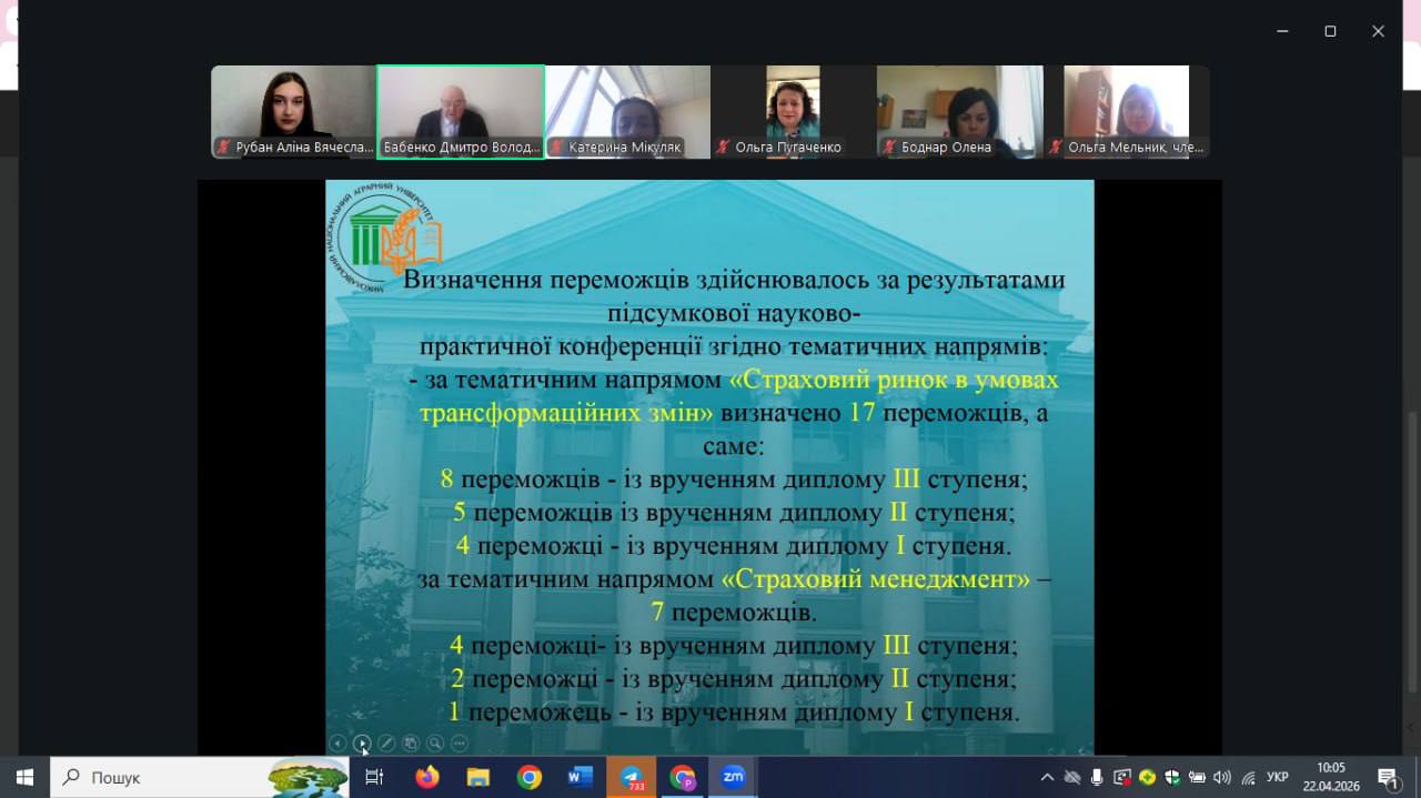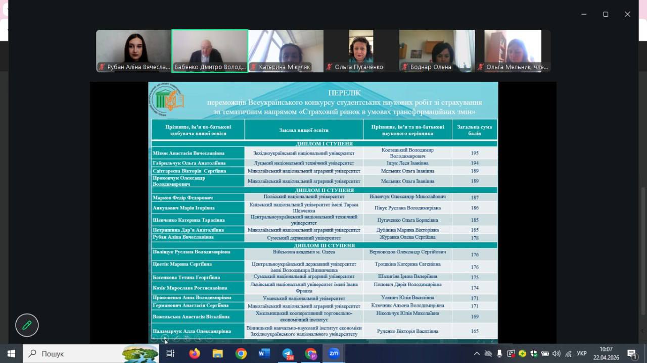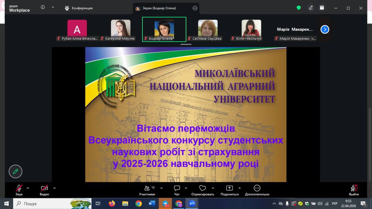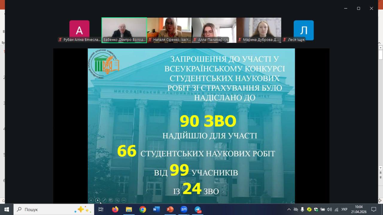 21 квітня 2026 року на базі обліково-фінансового факультету Миколаївського національного аграрного університету відбулася підсумкова науково-практична конференція Всеукраїнського конкурсу студентських наукових робіт зі страхування. Конкурс проводився за двома напрямами: «Страховий менеджмент» та «Страховий ринок в умовах трансформаційних змін».