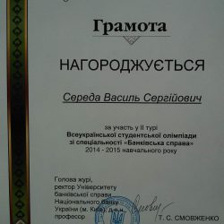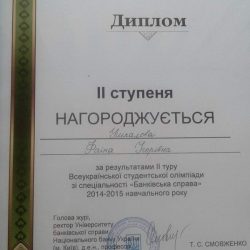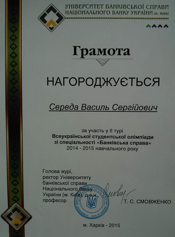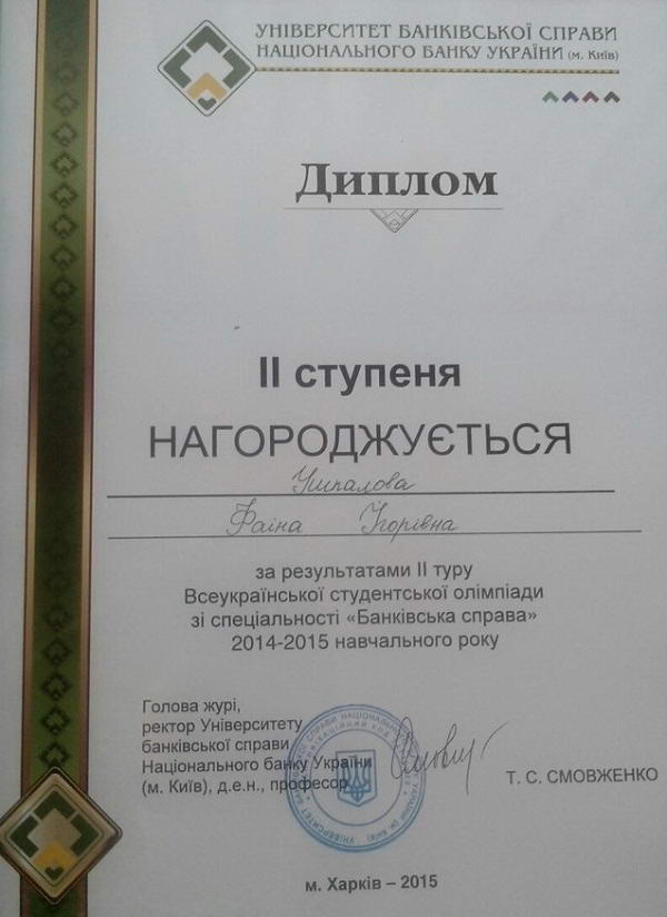 Перемога у II-му етапі Всеукраїнської студентської олімпіади з напряму підготовки «Фінанси і кредит» спеціальності «Банківська справа» в Харківському інституті банківської справи Університету банківської справи Національного банку України