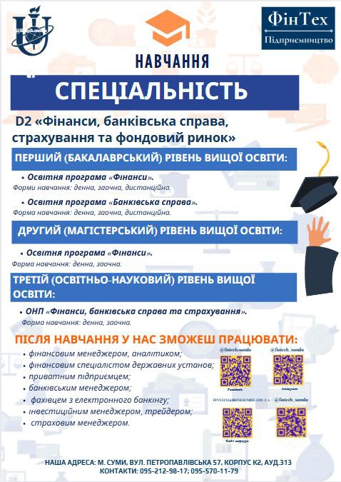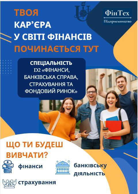Хочеш відчути світ на дотик, навчаючись на кафедрі фінансових технологій і підприємництва? Тоді спеціальність D2 «Фінанси, банківська справа, страхування та фондовий ринок» — саме для тебе!