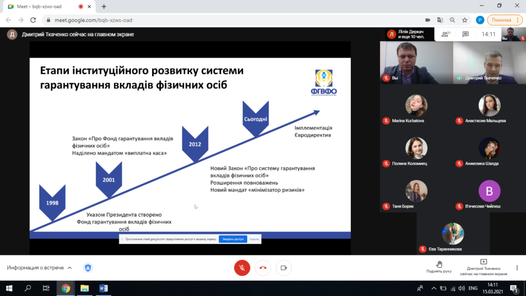 11 квітня 2021 р. у межах вивчення дисципліни «Фінансові ринки» відбулась онлайн зустріч студентів 2-го курсу бакалавратури, які навчаються за спеціальністю «Фінанси, банківська справа та страхування», з начальником відділу виявлення та дослідження фактів нанесення шкоди Фонду гарантування вкладів фізичних осіб Ткаченком Дмитром Олександровичем. Тема лекції «Фонд гарантування вкладів фізичних осіб: еволюційні зміни та основні виклики».