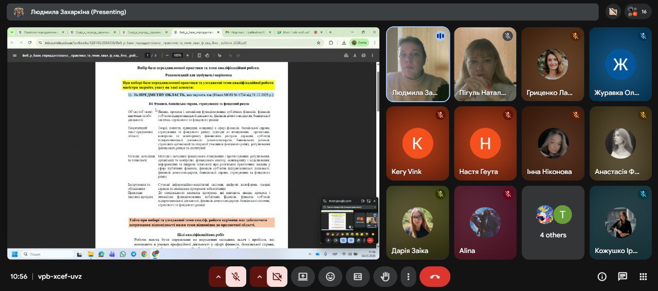 Під час зустрічі здобувачів ознайомили з організаційними аспектами проходження переддипломної практики, методичними рекомендаціями та вимогами до структури звіту з практики. Відповідні матеріали та організаційна інформація розміщені на сайті кафедри фінансових технологій і підприємництва та в навчальному курсі на платформі MIX.
